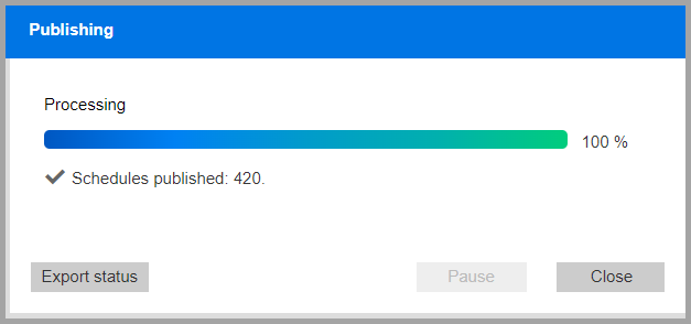 If no issues occurred during the publishing process, or if issues occurred but you did not select Pause if issues occur, the system completes the publishing process. It displays a status message with the number of schedules published (and schedules not published if issues occurred).